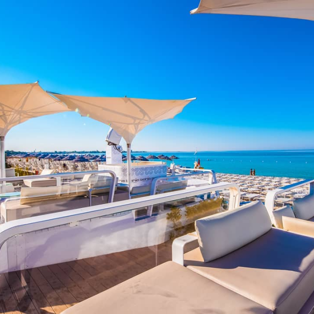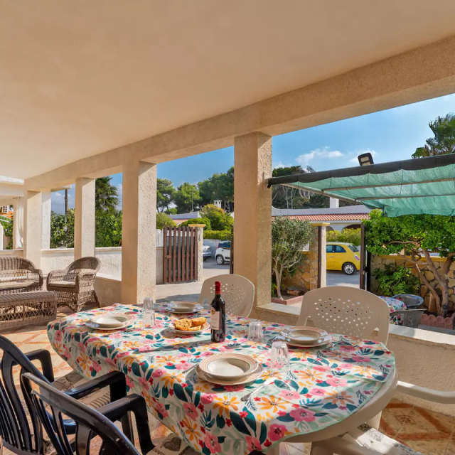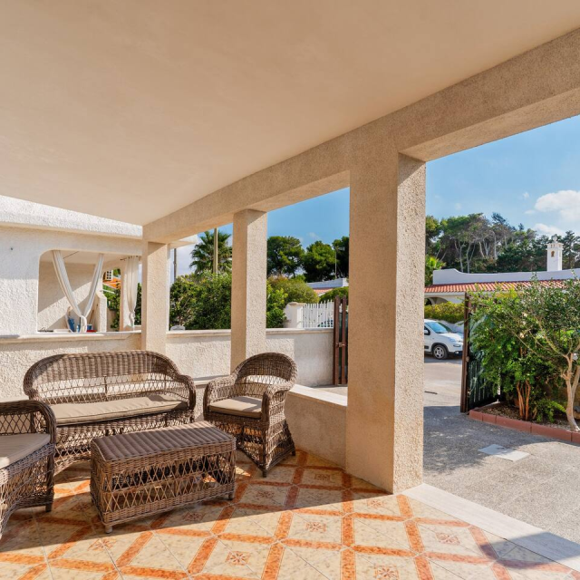 ampia veranda coperta con tavolo sedie e salottini per consumare pasti all’esterno