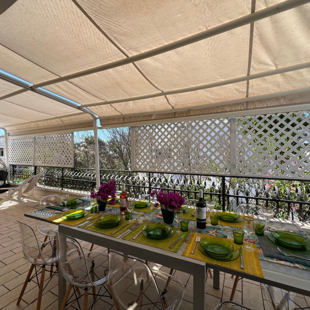- ampio salone living, con sala da pranzo e terrazzo a livello di 30 mq corredato da grandi tende parasole.