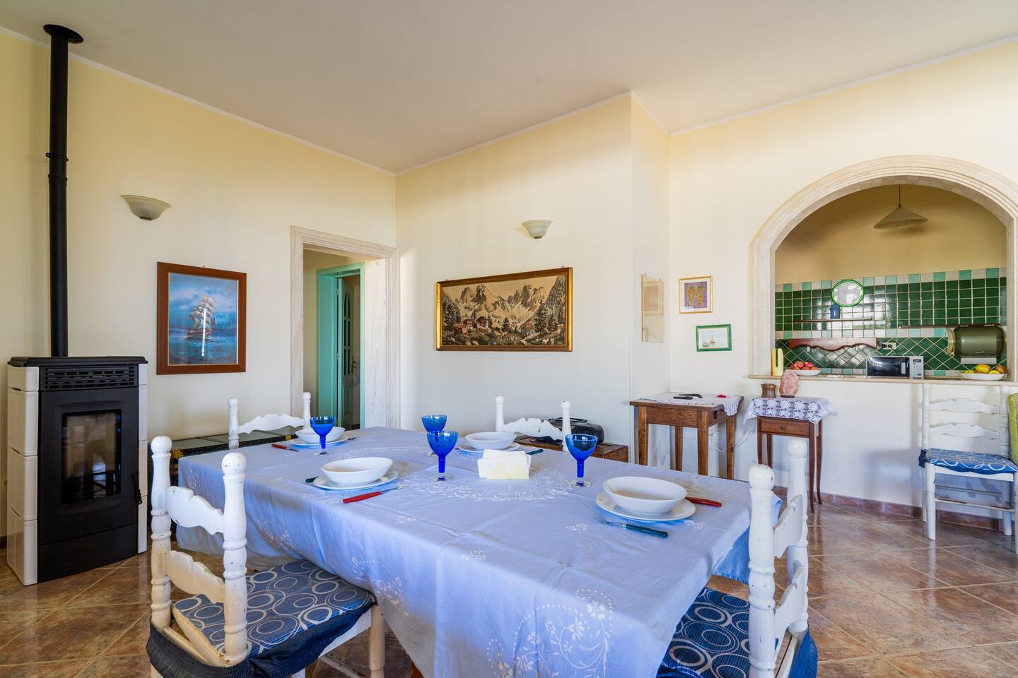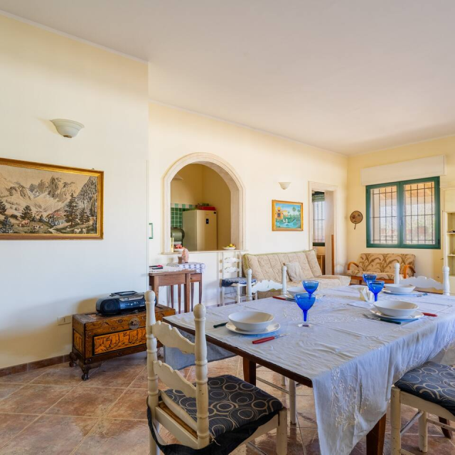 ampia sala da pranzo con divano letto matrimoniale, tavolo e sedie climatizzata