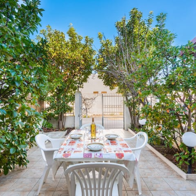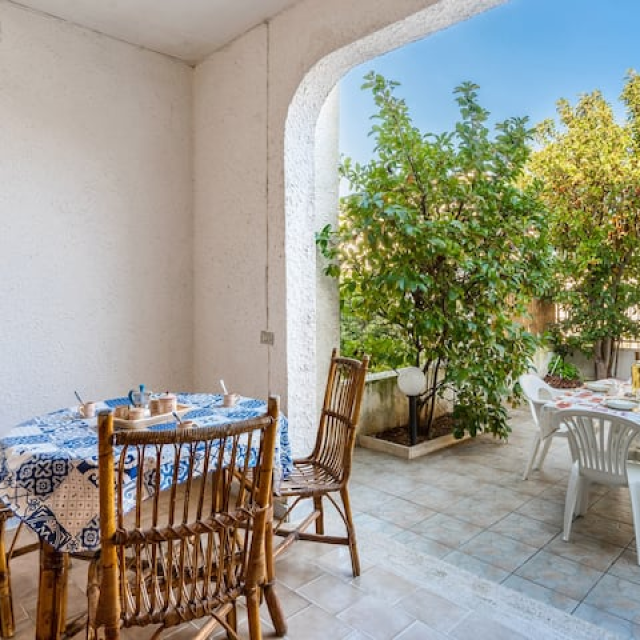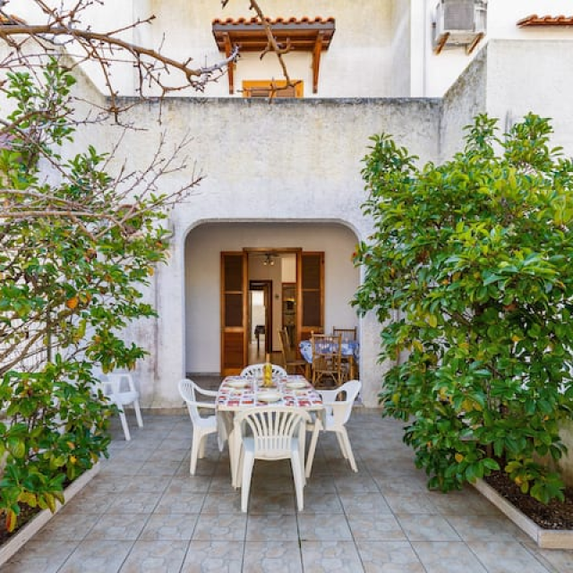 grande spazio esterno con tavolo e sedie per consumare pasti all’aperto