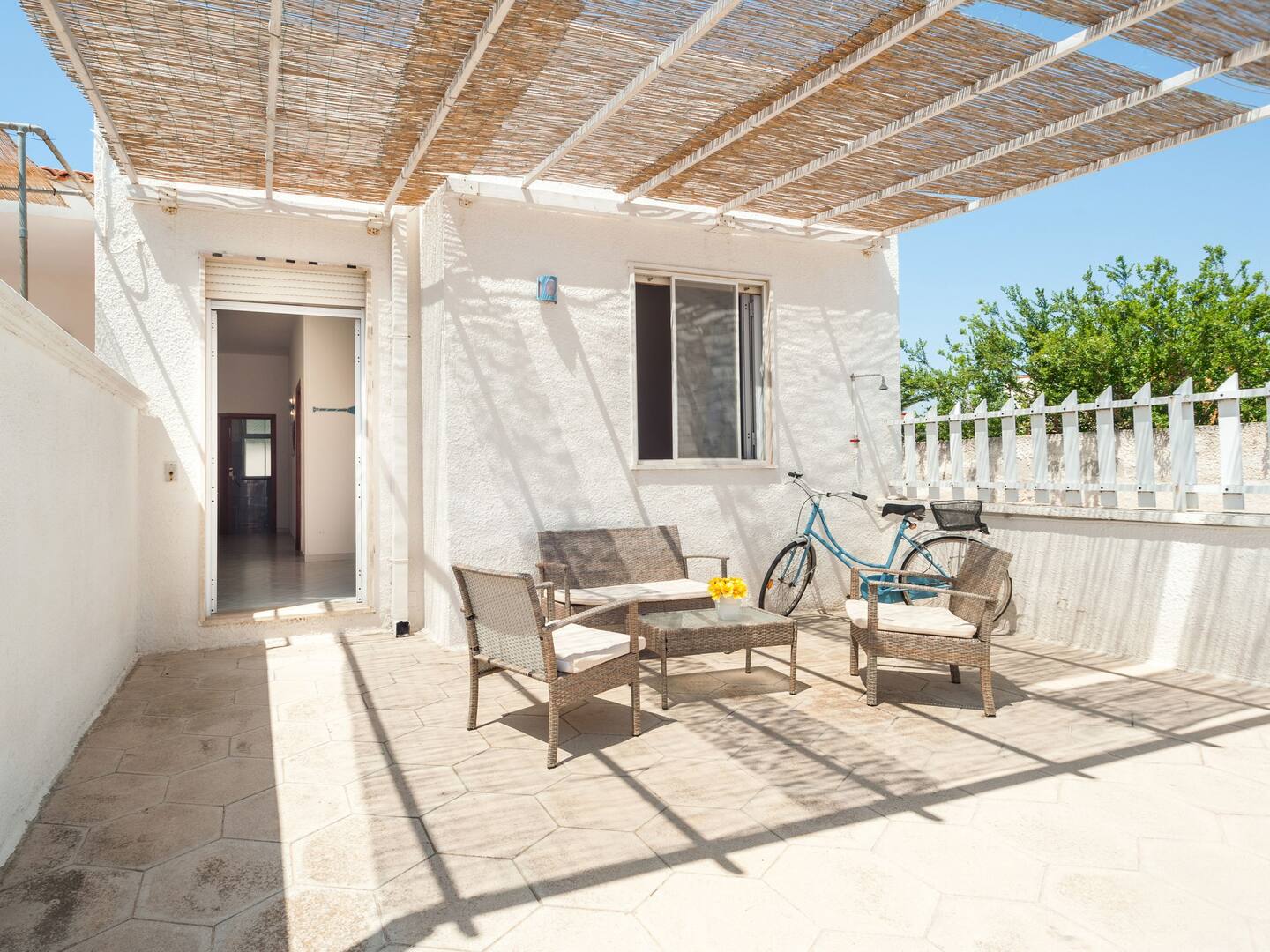 -entrata con ampio giardino e doccia esterna