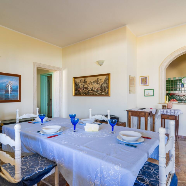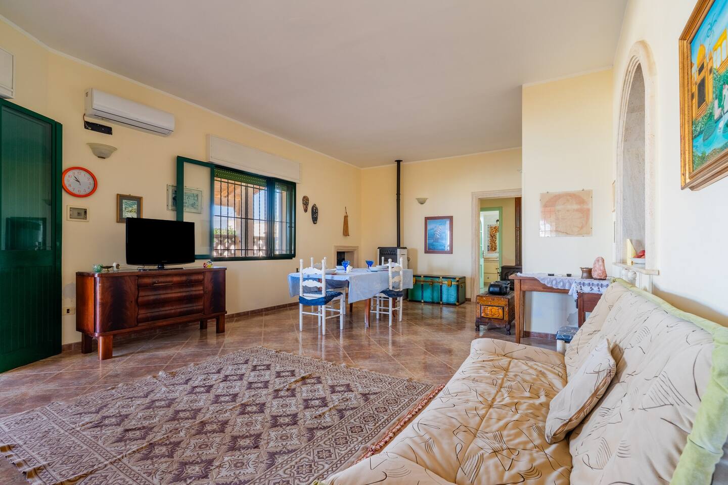 ampia sala da pranzo con divano letto matrimoniale, tavolo e sedie climatizzata