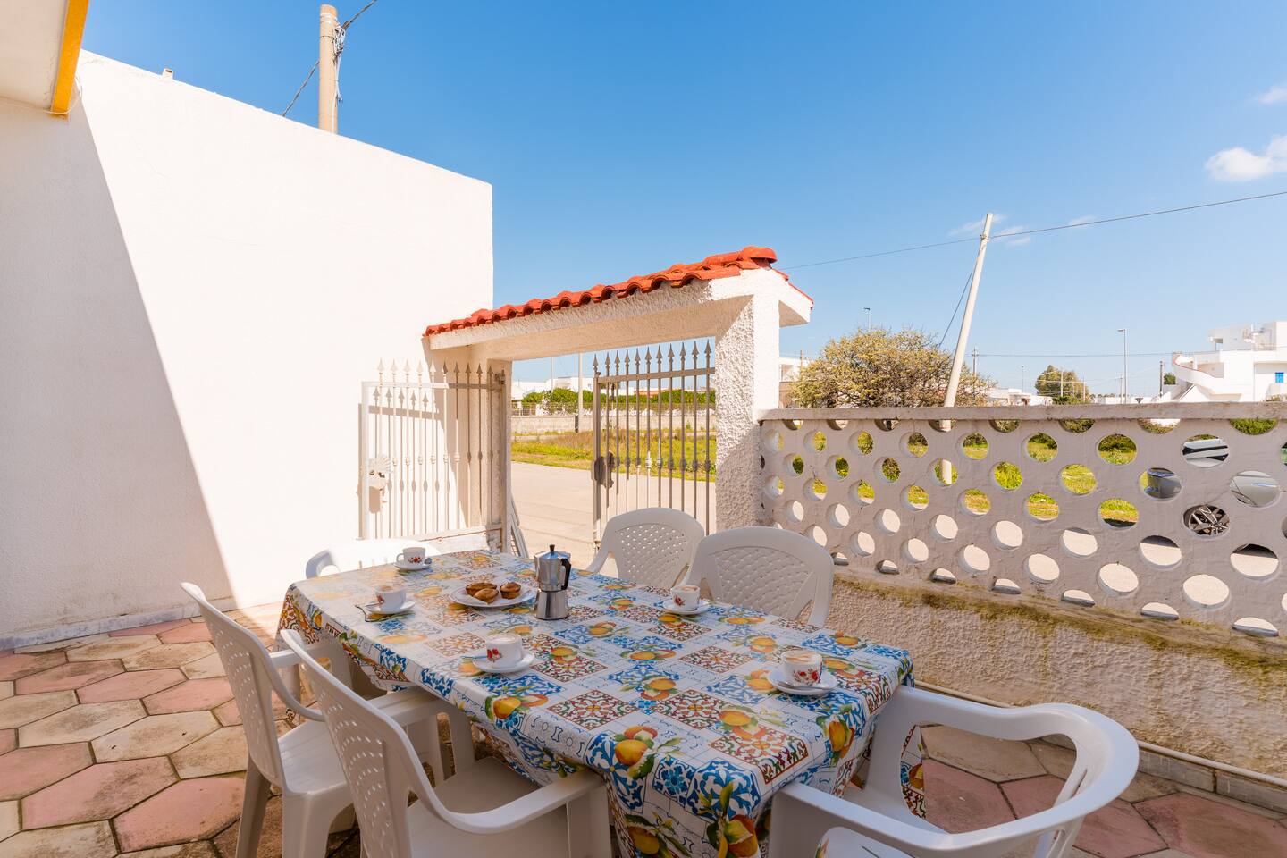 -entrata con ampio giardino e doccia esterna tavolo e sedie per consumare pasti comodamente